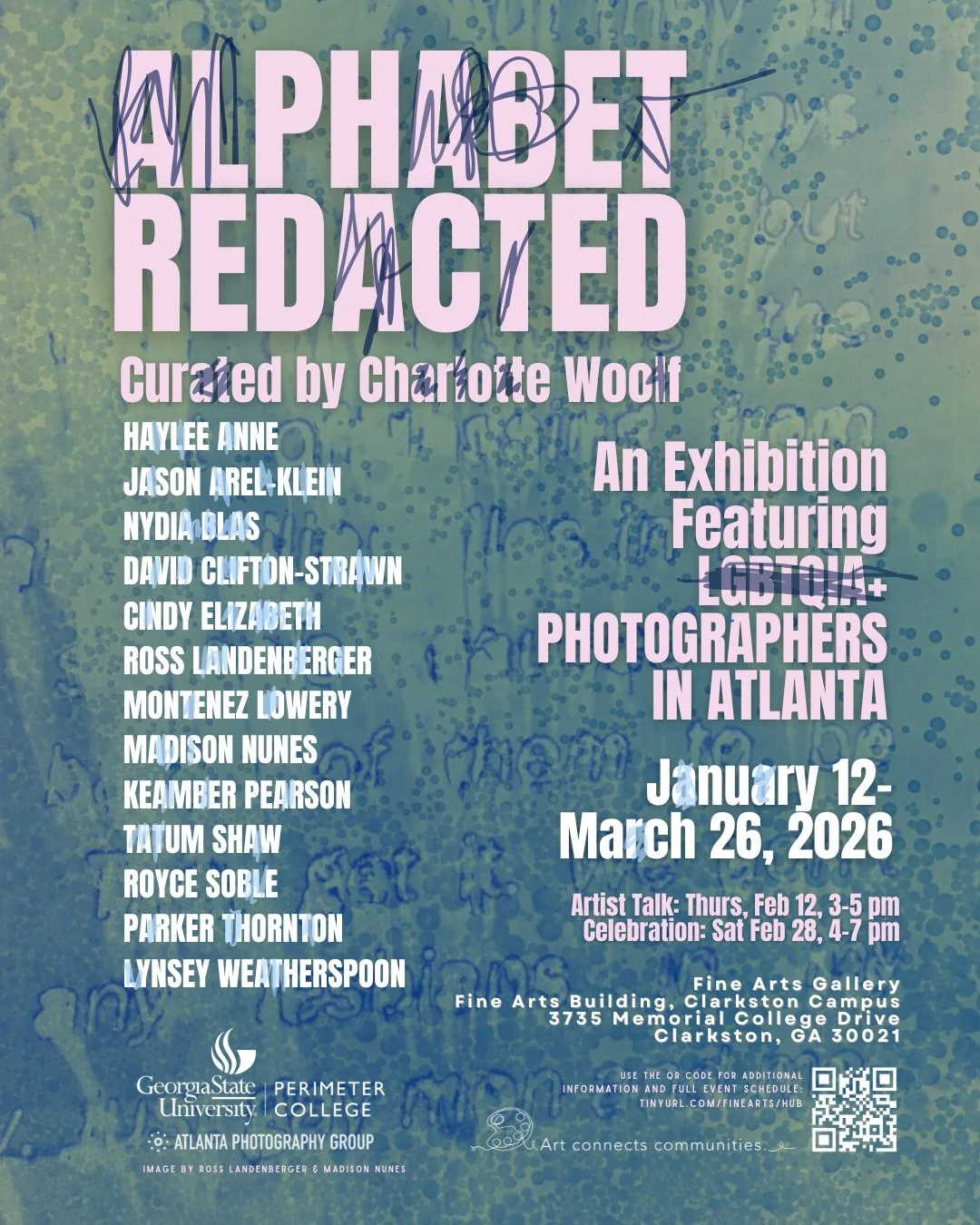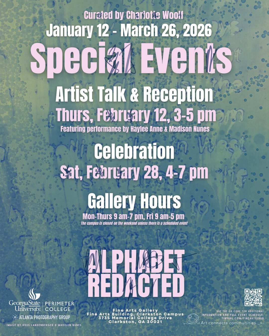 Curated by Charlotte Woolf, Alphabet Redacted is on view at Georgia State University's Perimeter College Clarkston Campus in the Fine Arts Gallery from January 12 to March 26, 2026.